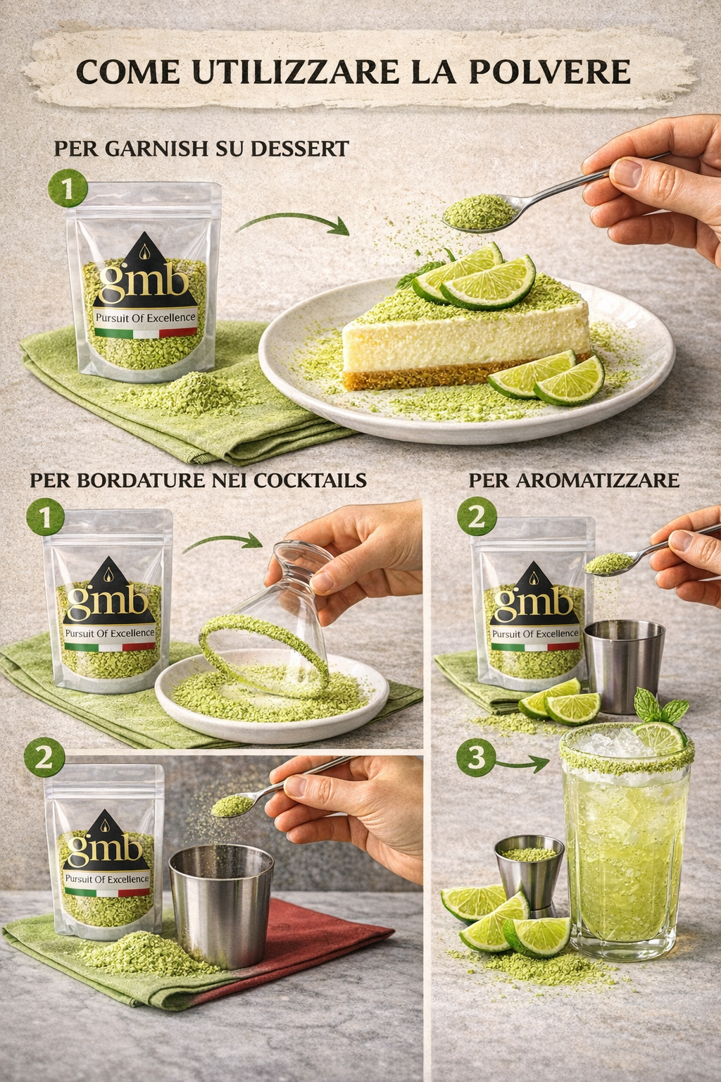 La polvere liofilizzata di lime GMB nasce per offrire a bartender, chef e professionisti del food & beverage un ingrediente tecnico capace di portare acidità naturale, freschezza agrumata e intensità aromatica in qualsiasi preparazione.